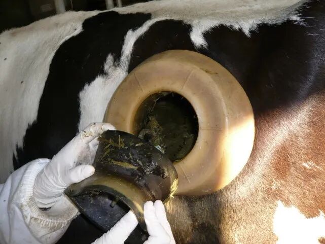 研究人员为了对肉牛或者奶牛的消化系统进行研究和分析,通过手术给牛安装一个套管,然后通过套管直接进入牛的瘤胃,随时获取牛胃中的样本。