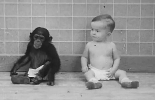 虽然,现在肯定不允许这样的实验,但其实试图把黑猩猩当人养的实验还有很多。