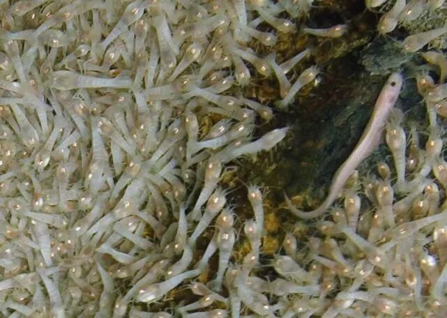 这个海底热泉最让人印象深刻的是,在喷口处密密麻麻的生活着成千上万的“无眼虾”,每平方米最多达到2000只,围绕在6米高的矿物塔尖附近,研究人员将这种虾命名为大西洋喷口盲虾(Rimicaris hybisae)。