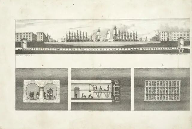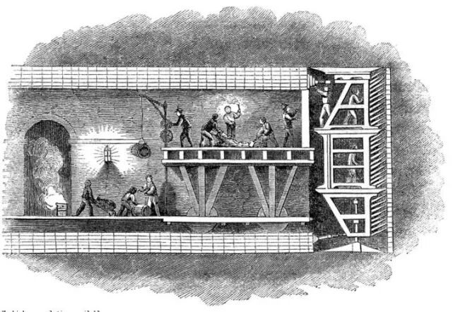 布鲁内尔设计的支架就像一个巨大的矩形铁墙,里面有几排小的工作窗,这些工作窗可以供36个工人开凿隧道。