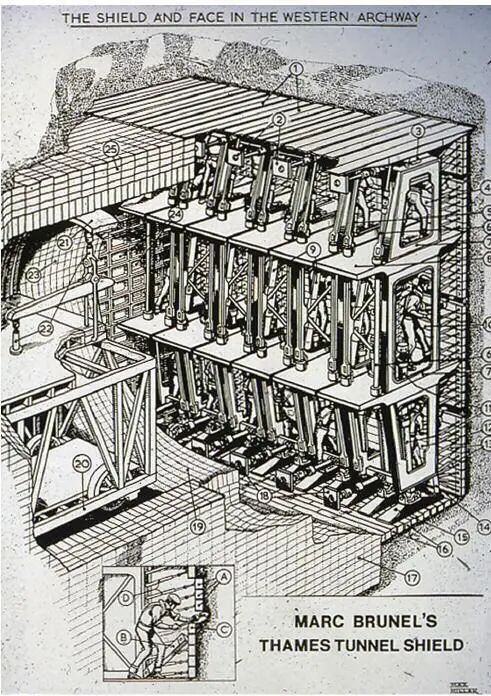 早在1818年,一位名叫马克·布鲁内尔(Marc Brunel)的法国工程师发明了一种设备——隧道掩护支架,这种设备可以让工人们在水下挖隧道,而不用担心水和泥浆会灌注进来