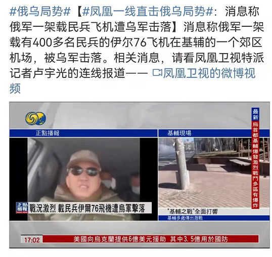 2、在俄乌冲突的第一天,就有人爆出俄罗斯一架伊尔76运输机被击落,机上400名车臣伞兵死难,这个“新闻”,就是这位凤凰大记者卢宇光炮制出来的。