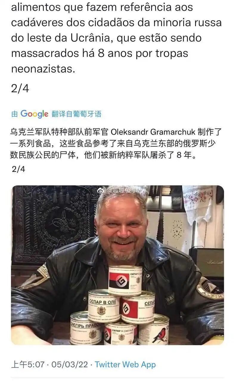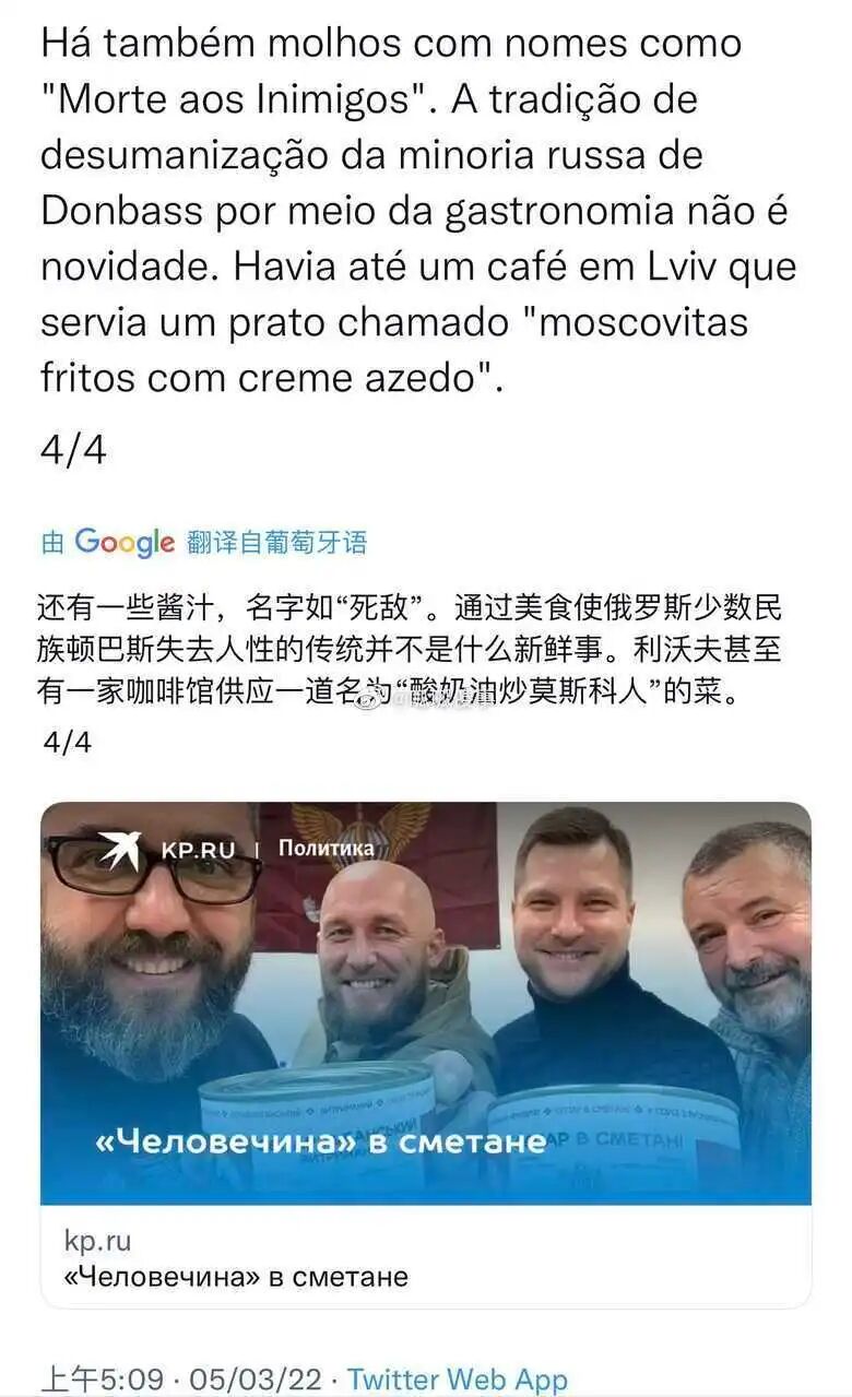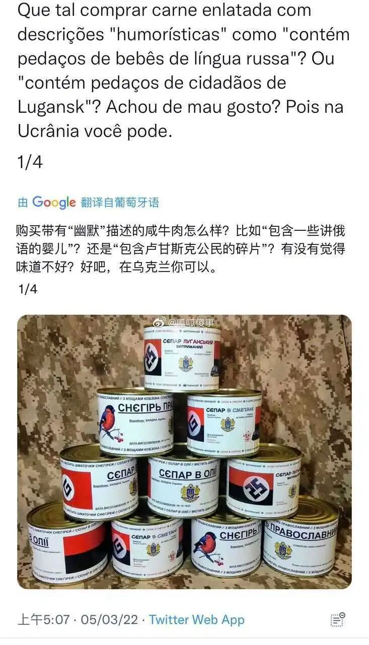 乌克兰人甚至还搞出了一款包含“讲俄语婴儿碎片”、“卢甘斯克公民碎片”的罐头,公开售卖,没有人判他们有罪,也没有任何媒体批评。