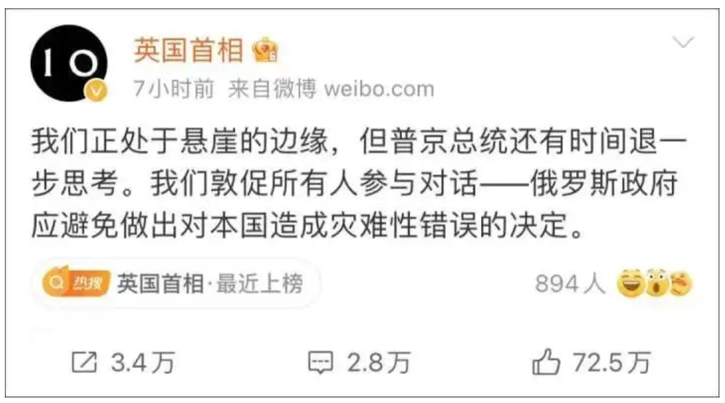 更离谱的是,英国首相跑到社交媒体上恐吓普京,说你好自为之,不要做出错误的决定……但这个社交媒体是微博,普京一来不懂中文,二来不上微博,请问约翰逊对谁宣传?