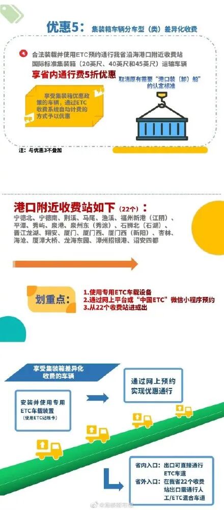 ● 对使用ETC总重小于等于20吨的6型合法营运货车在9.5折的基础上,予以通行费5折优惠。