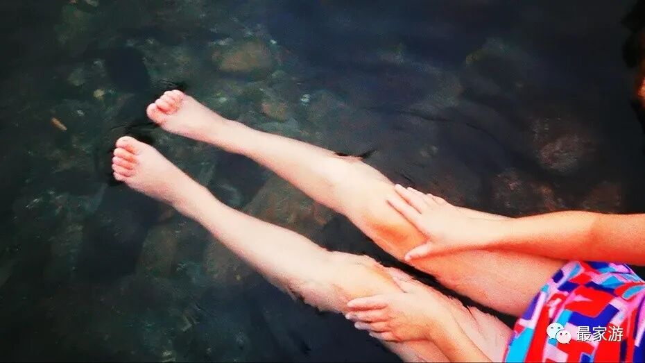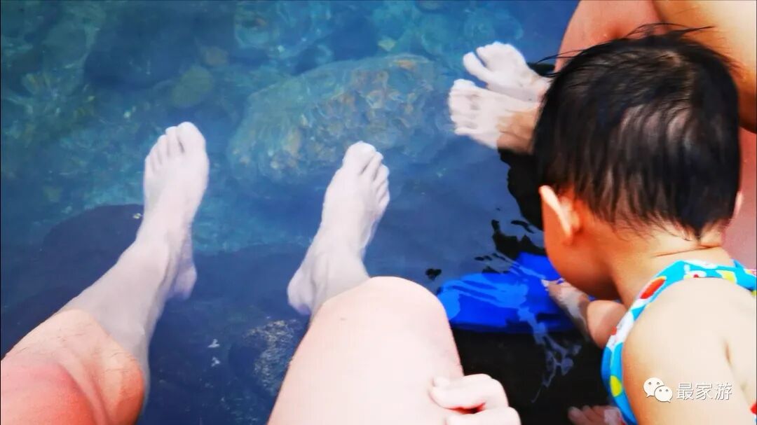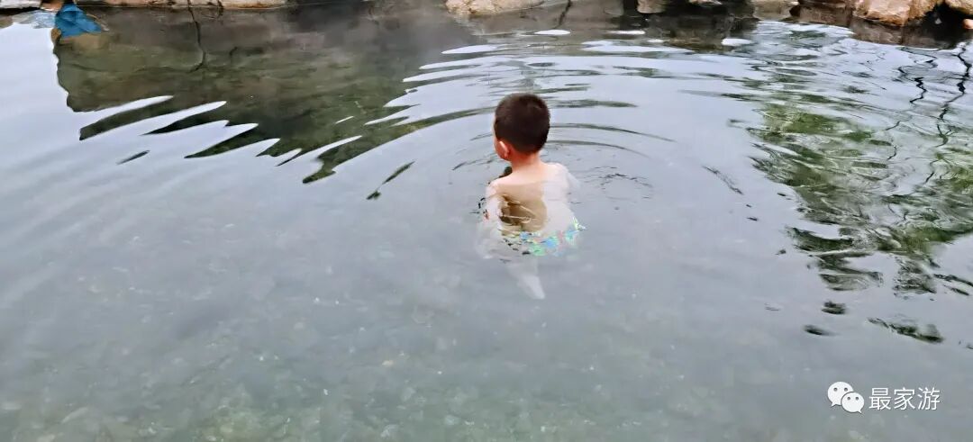 谈妥之后,一家人在临时搭建的茅草屋换好衣服,便开始淌温泉了,彼时,水温略高,不过池子里已经有好几个不怕烫的游客在享受了,转了大半圈才找到一处水温刚刚好的浅水之地,没听见扑通扑通,只有啪嗒啪嗒的淌水声,小太阳是乐的合不拢嘴。