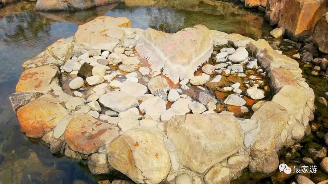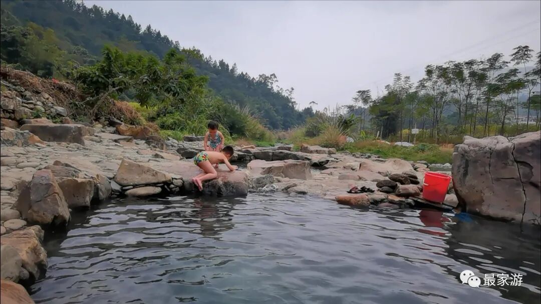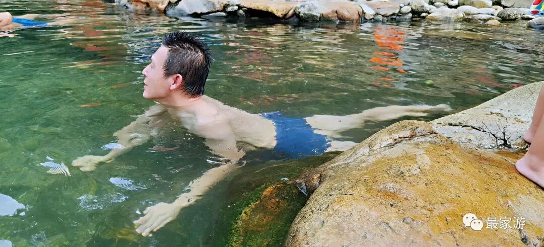 做通工作后,爱人准备好一家人的泳衣裤,再骑上小电驴带上孩子走大路去往野温泉,我时不时抄点近路,几乎同时到达温泉点,每人收10块卫生费,孩子们全免,当天之内不限次数不限时间,当时已经是下午4点多了,便跟几个管事的阿姨们商量,我们一家在之后几天再来的话每天只需再交10块即可。