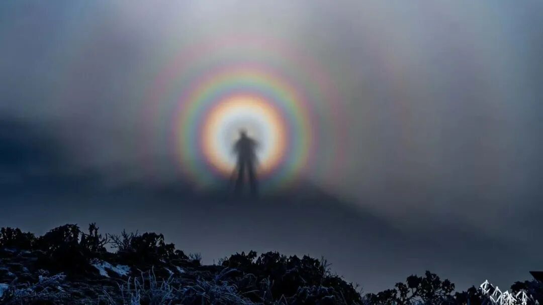 重轮叠影印岩腹,非烟非雾非丹青。我与化中人共住,镜光觌面交相呈。非云非雾起层空,异彩奇辉迥不同。试向石台高处望,人人都在佛光中。