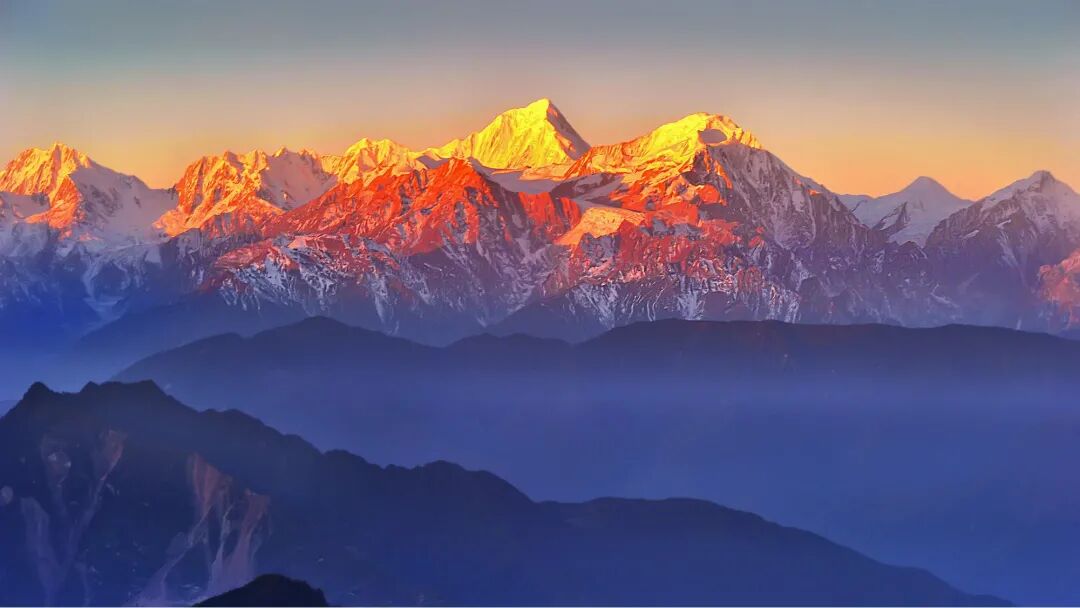 在晴日的凌晨,太阳光越过阻碍突然照射在雪山顶上,然后逐渐扩大,形成绝美的“日照金山”奇观,持续20分钟左右,最后雪山整体变白,失去金色印象。