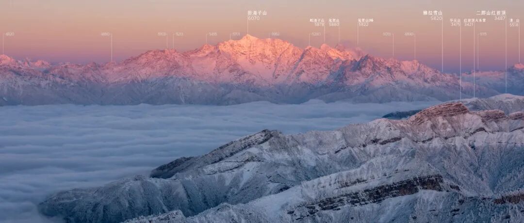 《国家地理杂志》描述:“在波涛滚滚的云海之上,一座座山峰梦幻般呈现开来,极目而望,自东向北、再向西,泥巴山、瓦屋山、峨眉山、夹金山、四姑娘山和二郎山在前,贡嘎雪山在侧,大渡河大峡谷在后,几乎天府之国的所有名山峻岭在此时都变成了玲珑盆景。而翻滚的云雾之下,群山丘陵逐级降低,缓缓融入稻浪翻滚的天府平原。”