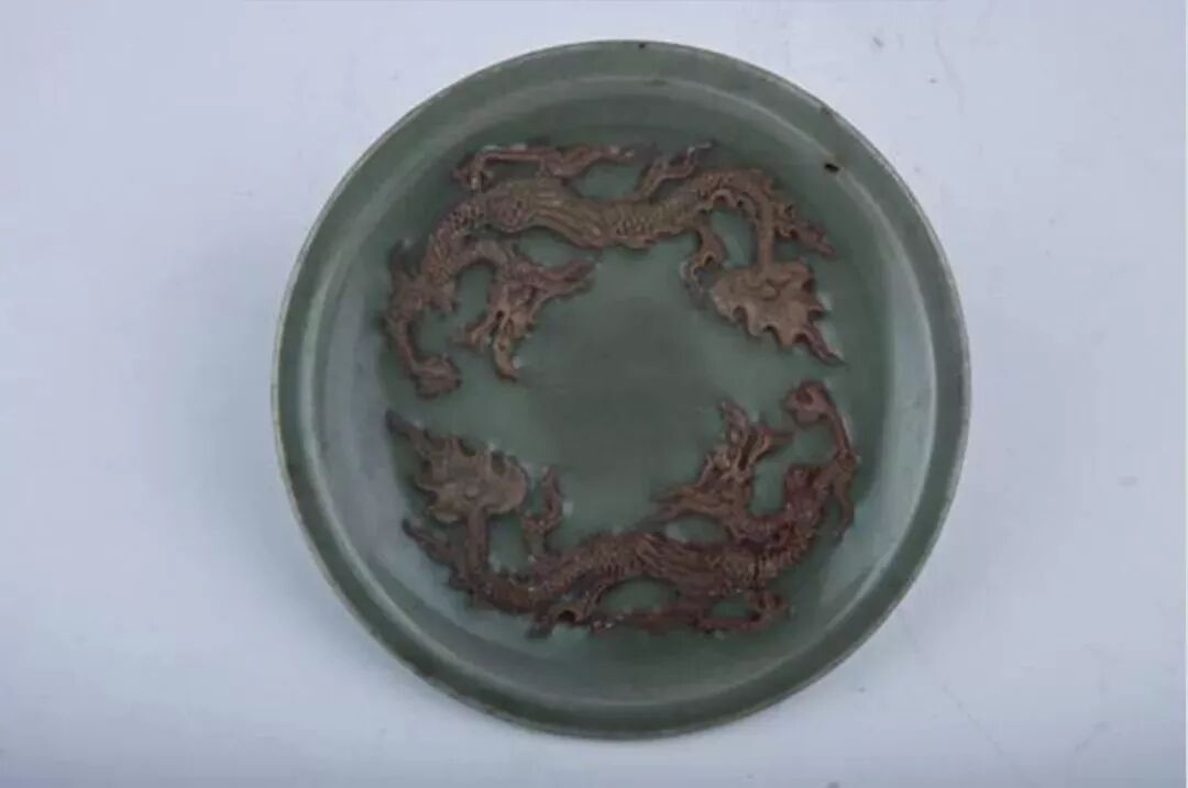 元露胎贴花双龙纹龙泉盘↑ 济宁市博物馆