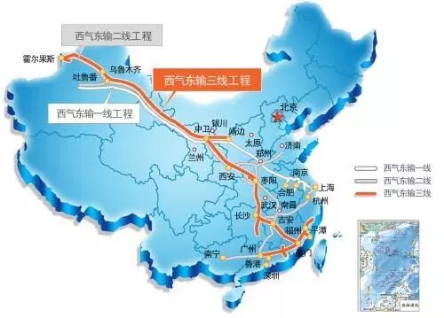 “西气东输”,我国距离最长、口径最大的输气管道,西起塔里木盆地的轮南,东至上海。全线采用自动化控制,供气范围覆盖中原、华东、长江三角洲地区。全长4200千米,管道长度创世界之最!