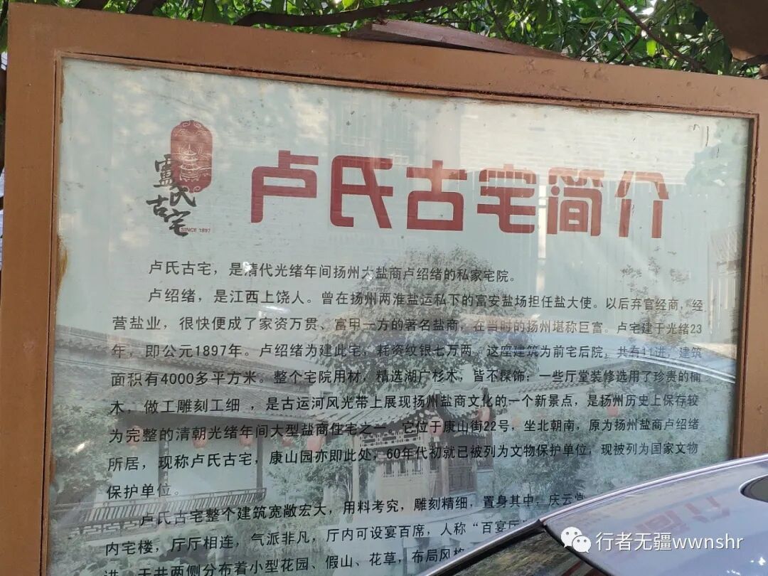 我参观了人文景观——朱自清故居,驱车在大街上,突然全国重点文保“盐商卢氏古宅”景点指示牌映入眼帘。