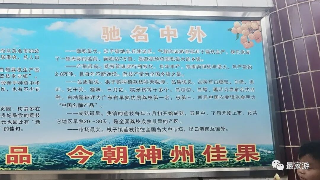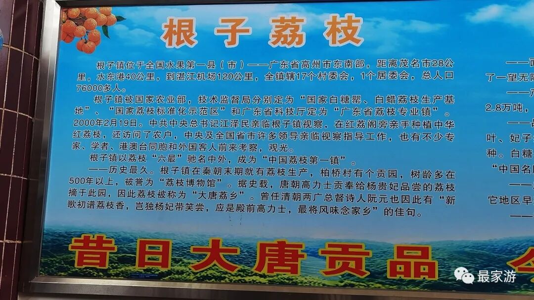 根子镇盛产荔枝,驰名千里,是国家白糖罂、白腊荔枝生产基地,之所以成为“中国荔枝第一镇”,是因为有以下“六最”驰名中外,包括历史最久、面积最大、产量最高、品质最优、成熟最早和市场最广,早在2000年时,时任国家最高领导人就曾来此考察,还在如今的一个旅游景点——红荔阁观荔亭亲手种植一株金蜜荔。