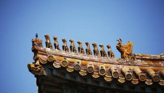 此外,屋檐的8条垂脊上各有十个栩栩如生的仙人走兽,最前面的是"骑鸡仙人",之后依次为龙、凤、狮子、天马、海马、狻猊、押鱼、獬犬、斗牛九种形态各异的走兽。