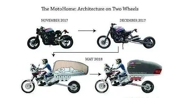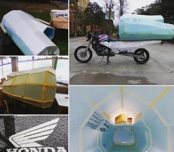 这位学生也在网上Po出了自己制造这辆“摩托房车”的大体步骤,首先他找到了一辆本田的CB车型作为基础,然后再为它换上了本田CR500越野车的长行程减震和辐条前轮毂,接着再把后摇臂进行加长,然后再运用自己所学的建筑知识为摩托车加上了一个“棺材房”然后就成为了世界上首辆“一体式摩托房车”了。