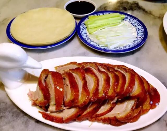 吃烤鸭主在其肉质与酱料,外皮酥脆,肉质鲜香,包上面皮,蘸上咸香清甜的酱汁,吃在嘴里酥香味美。