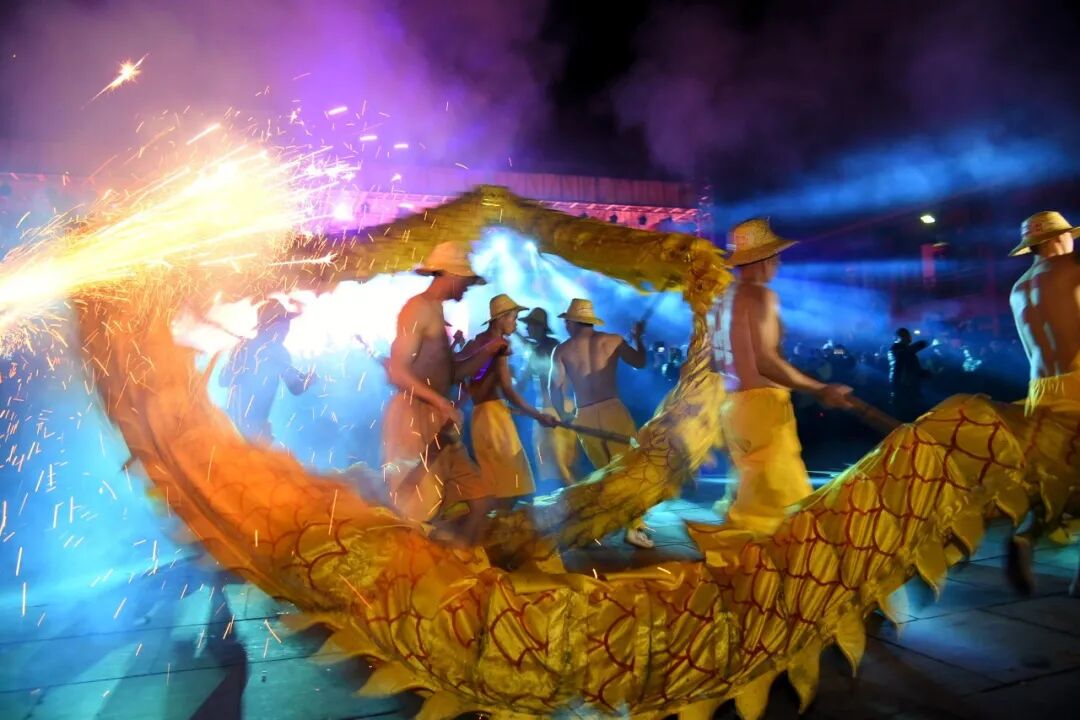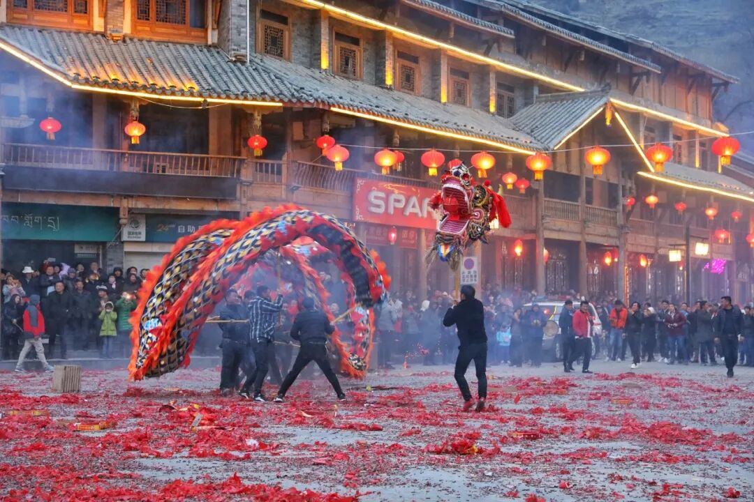 除了大红灯笼、春联、窗花,这里还有特色的川西传统民俗活动。热闹的龙狮节、馋人的美食节、斑斓的大型灯会、特色的民俗歌舞剧...