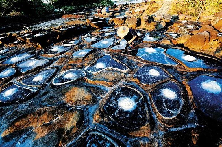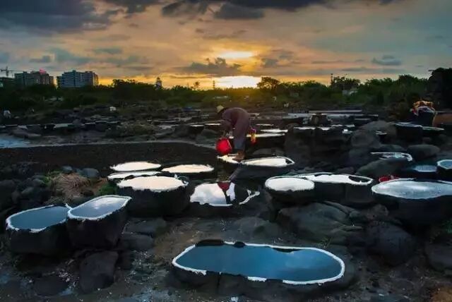 日落的夕阳,盐田,劳动的人儿,如此简单的画面也能让人心生向往。