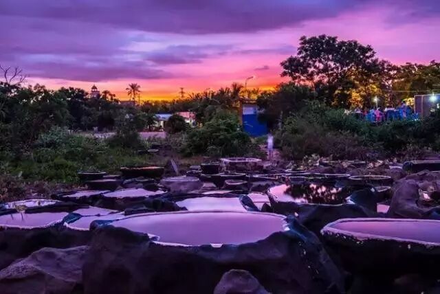 晚霞下的晒盐槽,犹如一颗颗璀璨的夜明珠。古盐田四周风景很美,最常见的植物就是仙人掌和野菠萝,而不远处就是著名的洋浦港。