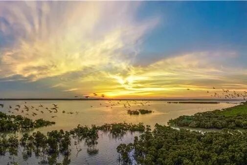东寨港红树林是我国面积最大的一片沿海滩涂森林,绵延海岸线总长28公里,因陆陷成海,形如漏斗,海岸线曲折多湾,泻湖滩面缓平,红树林就分布在整个海岸浅滩上。
