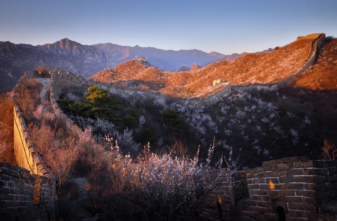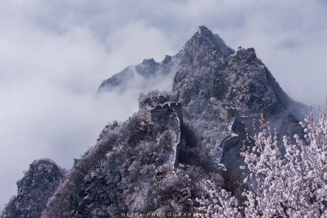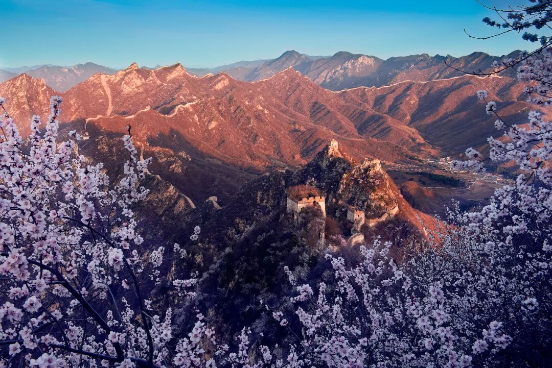 在未被开发的箭扣长城的山上,3月份山桃花盛开得正旺,悬崖峭壁,山涧中,甚至长城上都是繁华朵朵。