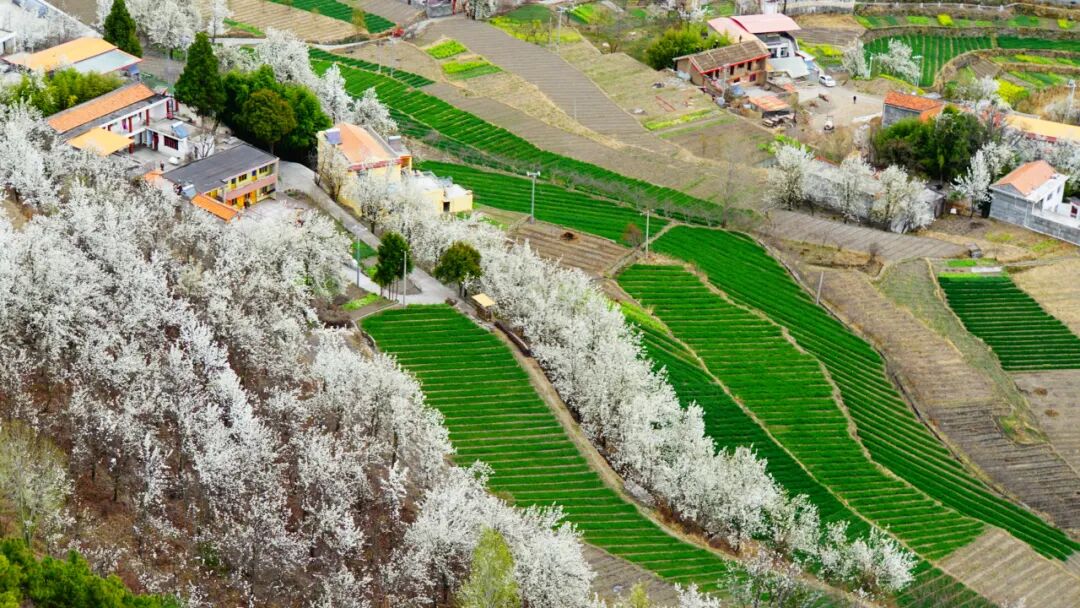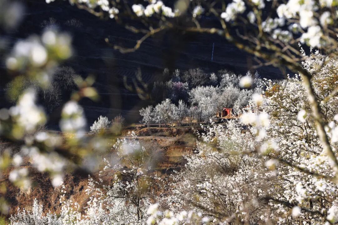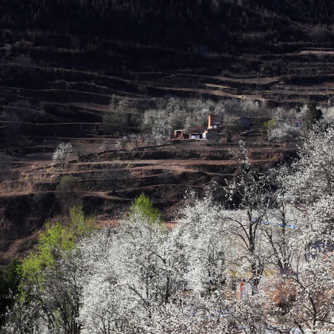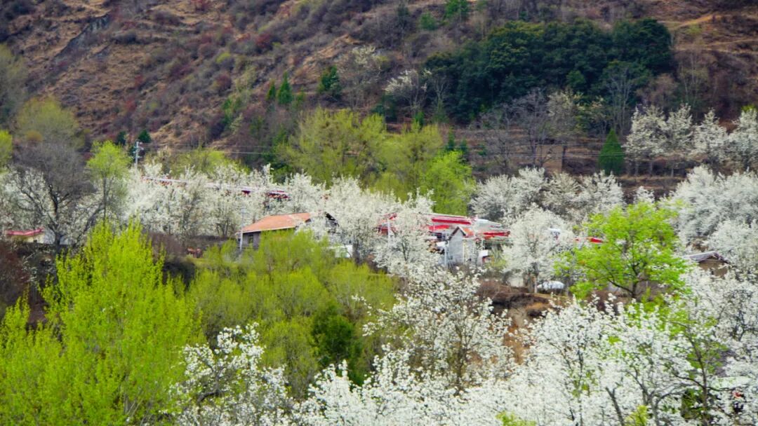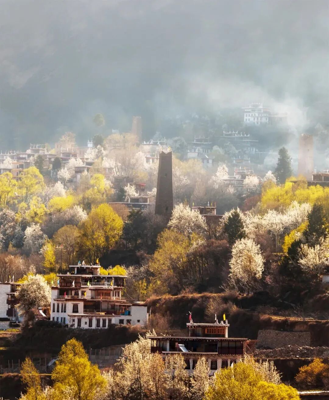 从高处远眺,梨花点缀下的藏寨显得更加钟灵毓秀。因为较高的海拔,花期会比相邻的金川梨花晚一周至半个月。