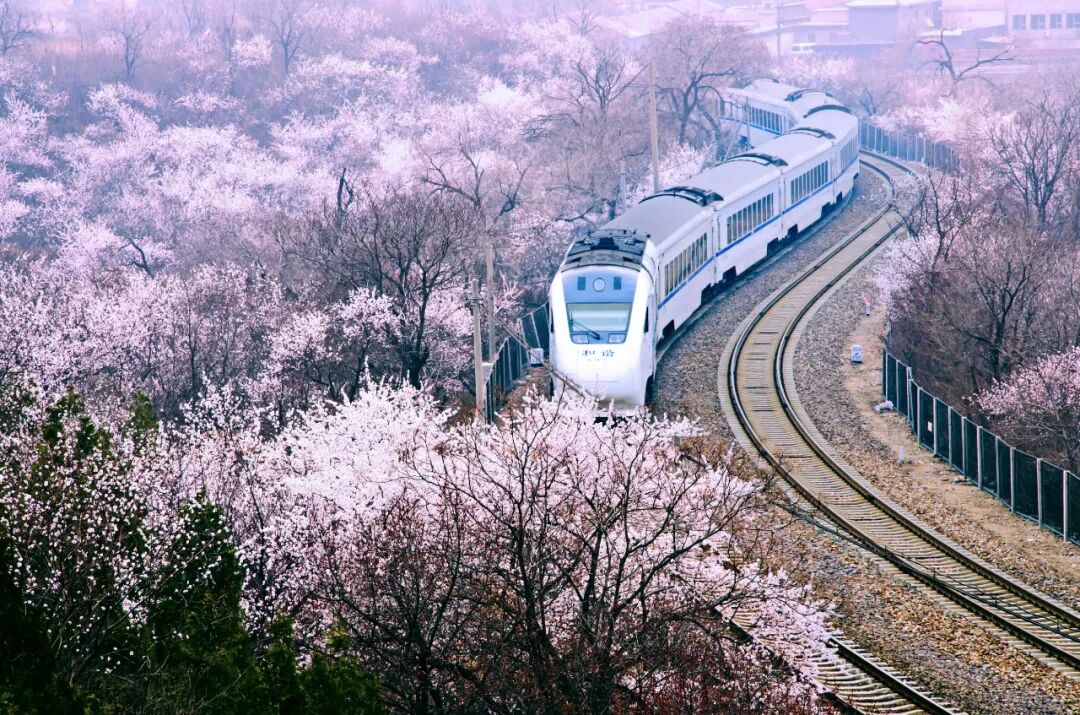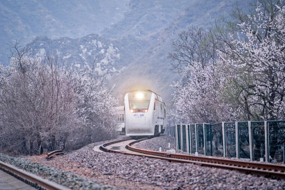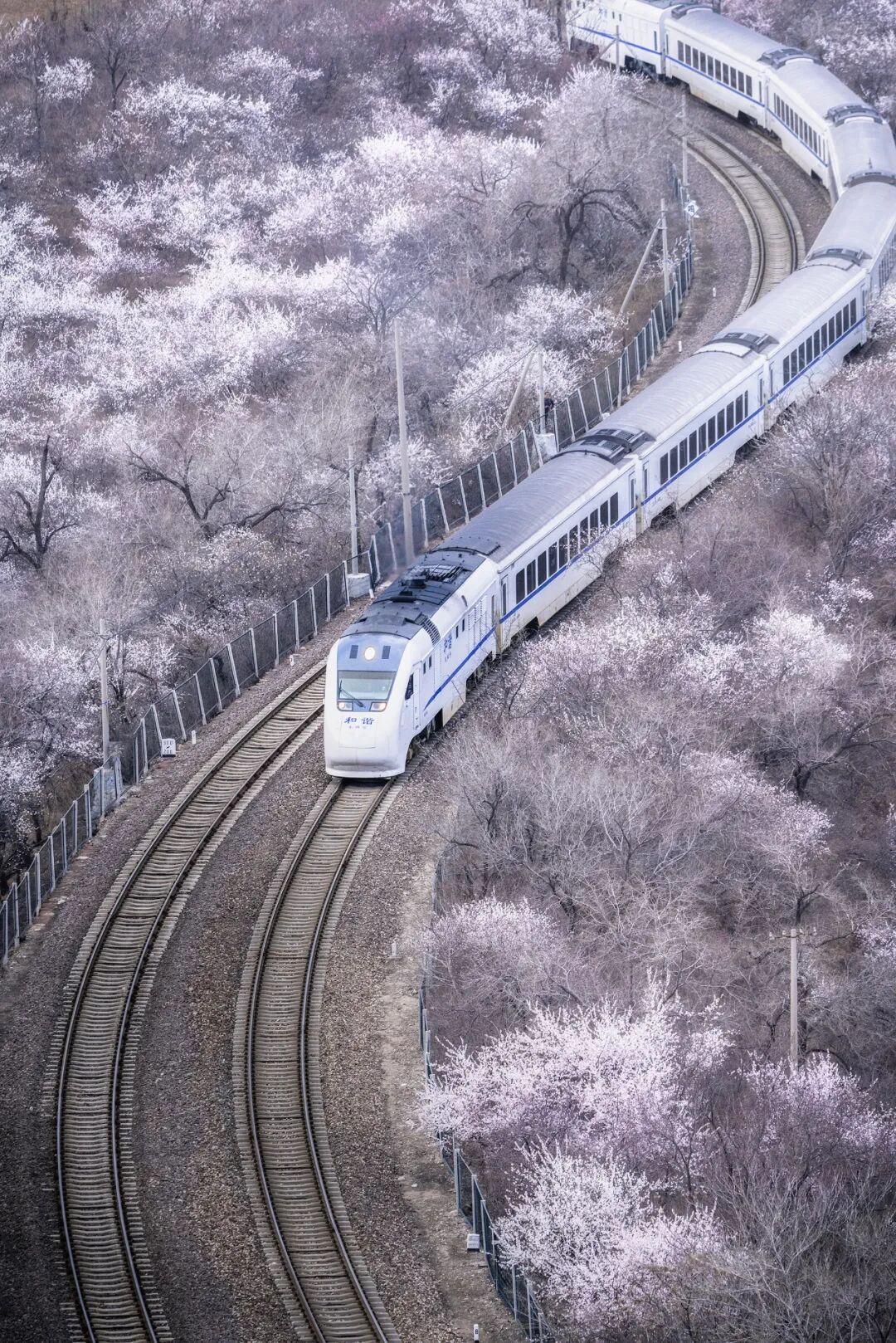 白色的火车和粉嫩的樱花相互衬托,站站都有美景,步步都有惊喜。除了在冬季去故宫看雪,春季乘坐S2赏樱,又是去北京的一个绝美的理由。