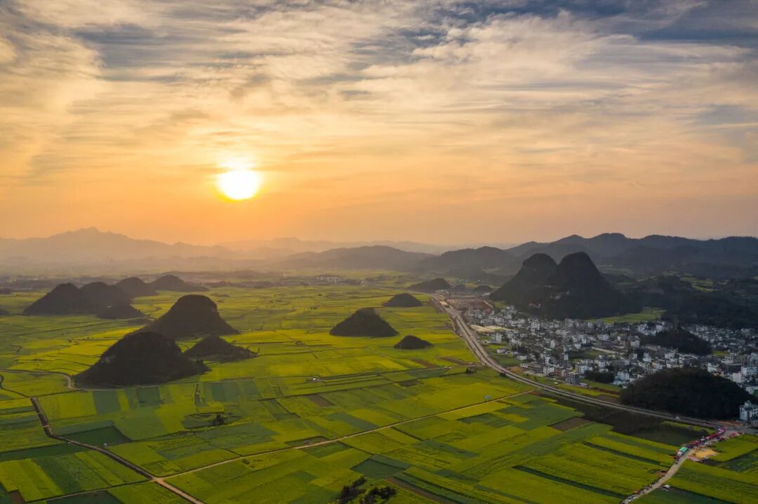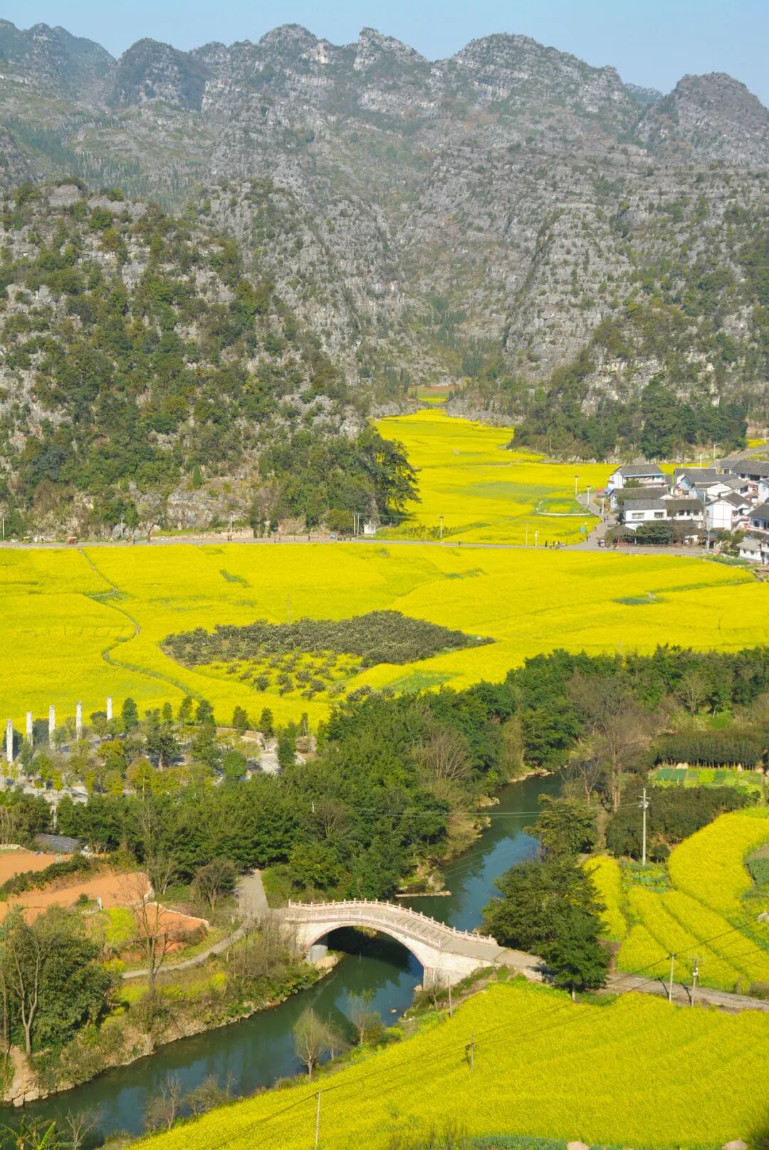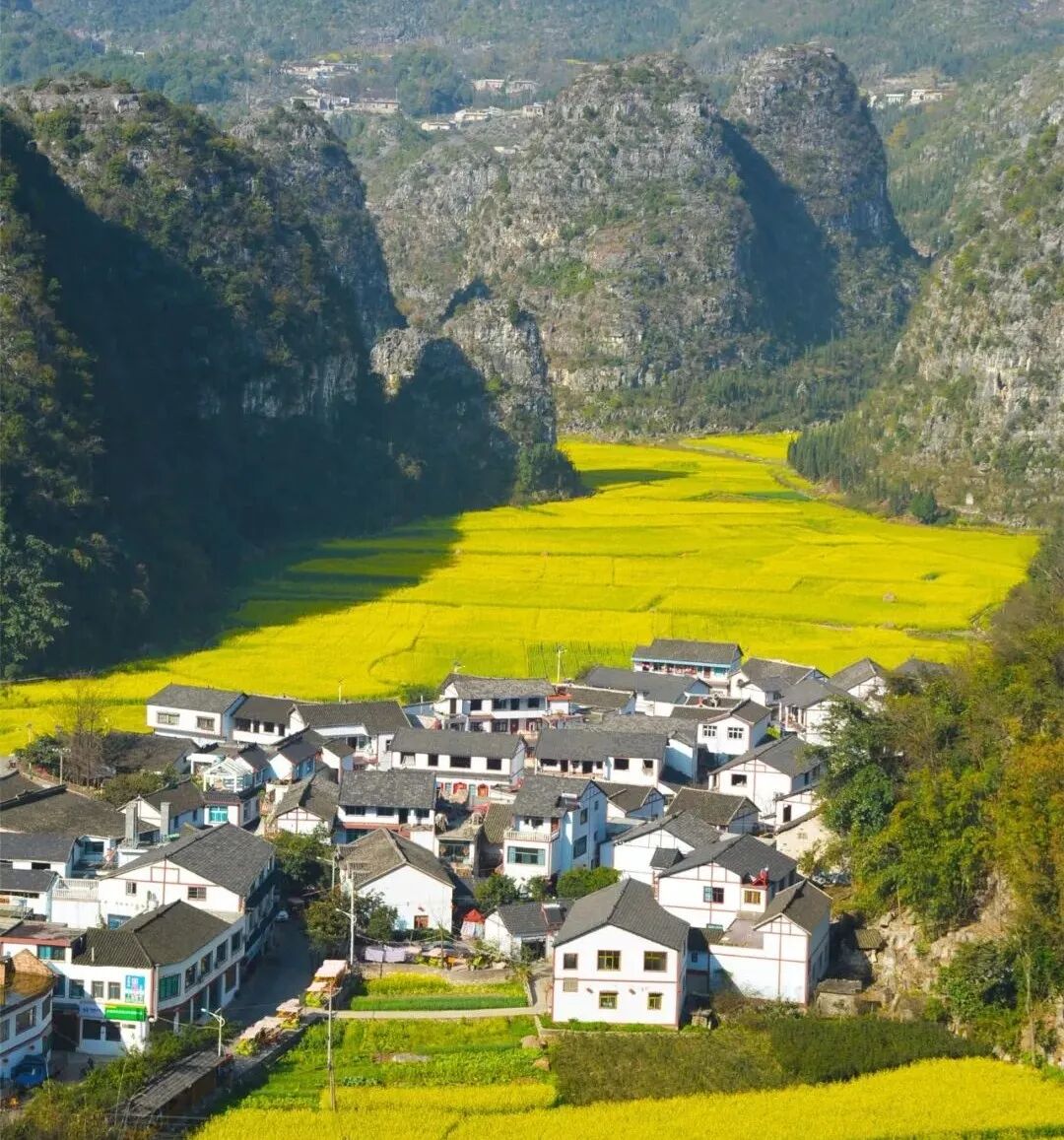 喀斯特土地上不仅能看到一座座拔地而起的峰林,在层叠的峰林间、在布依特色的农舍旁,一片片油菜花,把山水民居装扮得分外迷人。