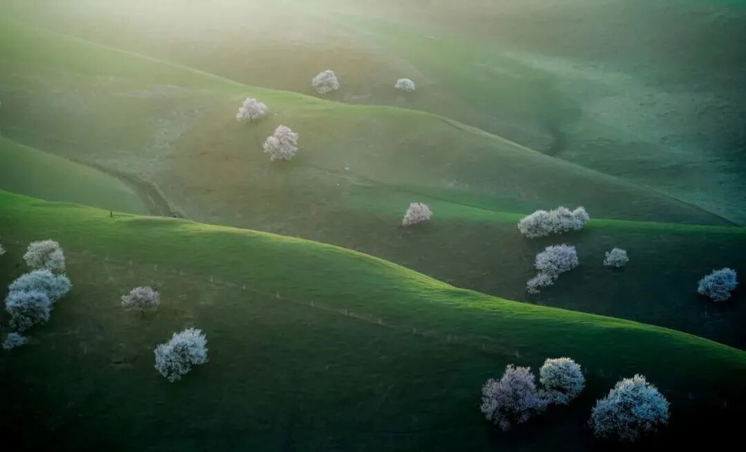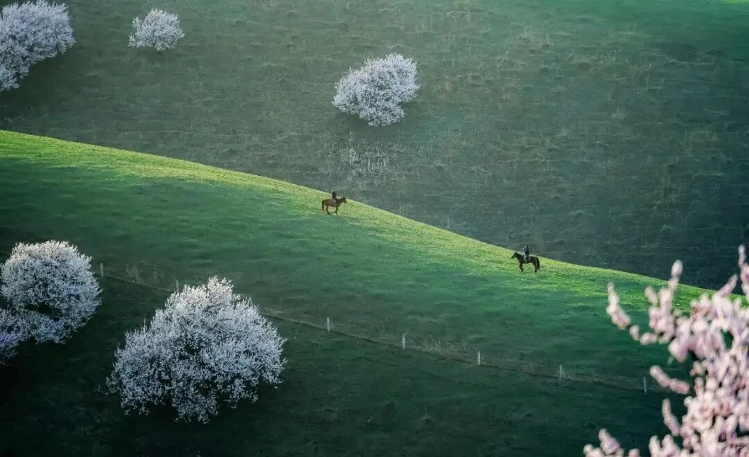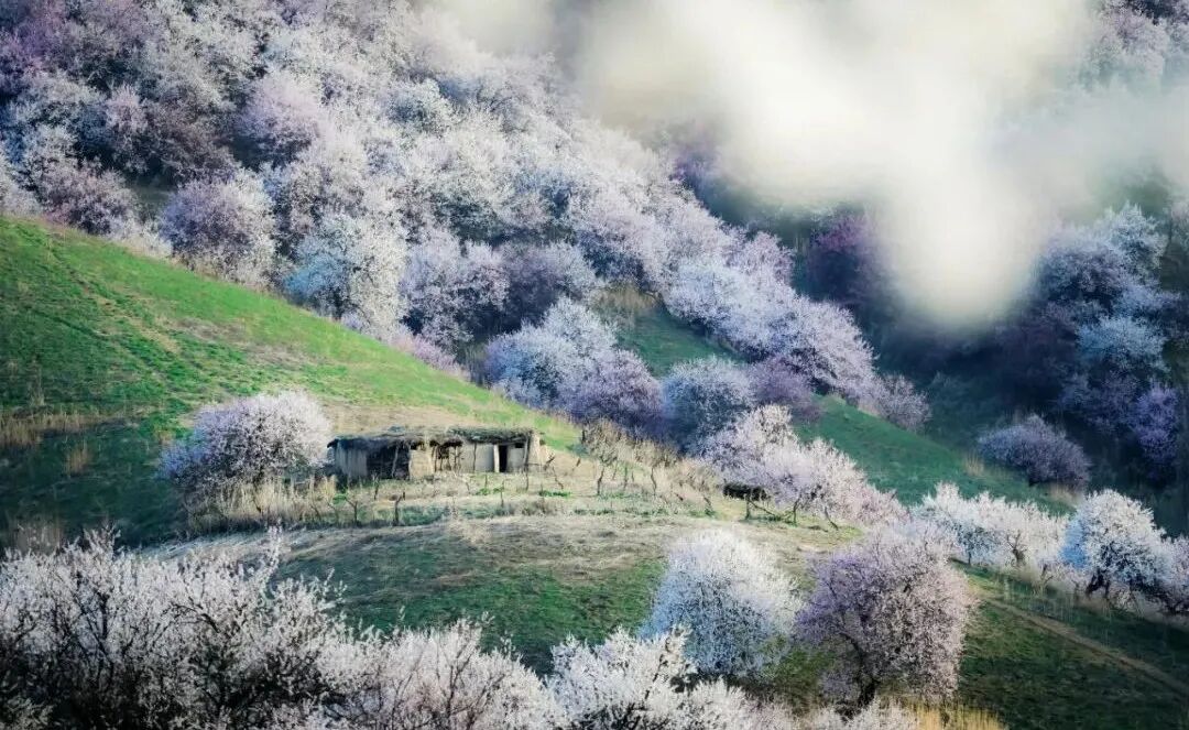 放眼望去,杏花随着河谷绵延而上,青青的草地,被淡粉色的杏花所染,4月自驾来新疆,千万别错过这里的杏花。