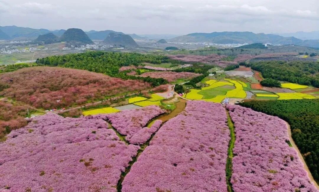 在黔西南布衣族自治州首府兴义市的万峰林,这里6000多亩观峰赏花的季节也在春节后相继开放。