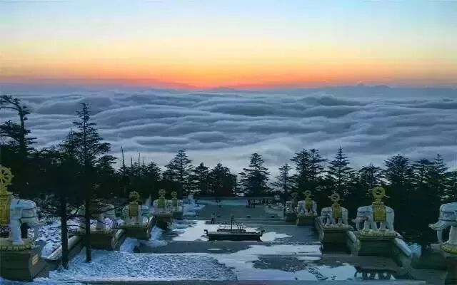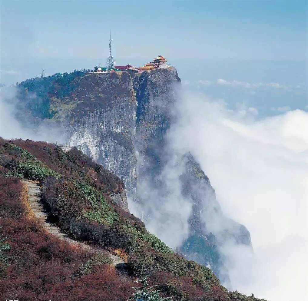 峨眉山地势陡峭,风景秀丽,素有“峨眉天下秀”之称,山上的万佛顶海拔3099米。金顶是峨眉山的象征,金佛是峨眉山的标志。金顶宝光是峨眉山最具特色的景观,无数人登上金顶守候几天几夜,只为一睹它的真容。