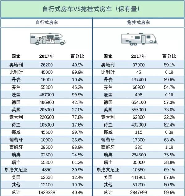 从表中我们可以看出,丹麦、美国、荷兰是以拖挂式房车为主的国家。虽然整体拖挂式房车受到全世界将近60%的选择,但也有像比利时或法国这样的国家,绝大部分以自行式房车为主。