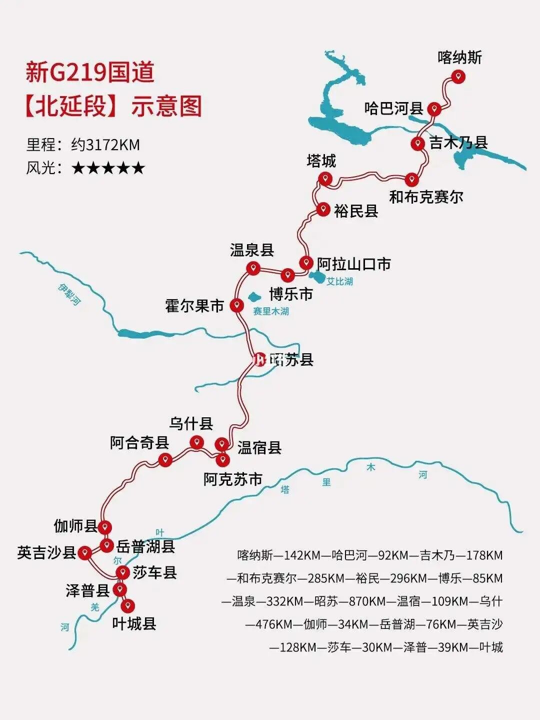 新219国道编号G219,又称喀东线,2018年3月5日,交通部将原G219(新藏公路叶城至拉孜)北端延伸至新疆北部喀纳斯(禾木喀纳斯蒙古族乡),南端改线延伸至广西(中越边境的)东兴市,经过新疆,西藏,云南,广西4个省市区,是我国西北、西南地区的边境公路,全长10065公里,是中国里程最长的国道。