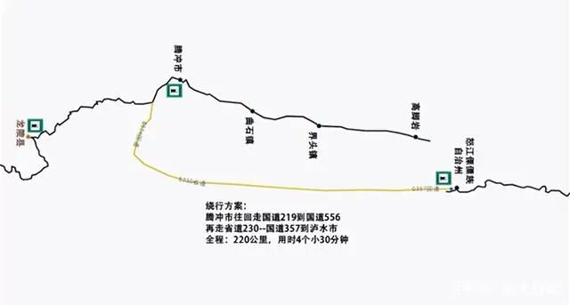 目前,腾冲段已经修到了龙川江源头附近,翻越高黎贡山的路段尚未见报道,从泸水到腾冲只能绕行556国道+230省道+357国道,大约220公里。
