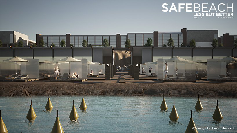意大利设计师为“海边经济”提出了一个名为“安全沙滩”的解决方案:通过使用有机玻璃隔间,将沙滩隔开为多个独立的私人空间,类似海滨酒店的露天房间 ,以此来达到社交隔离的目的。