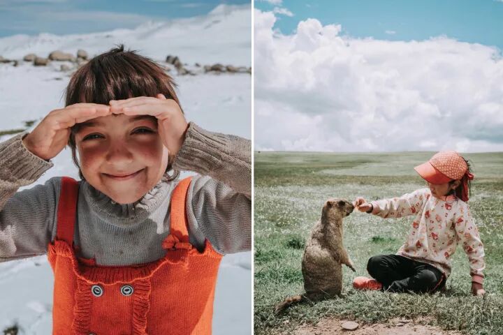 记录下藏族小女孩和土拔鼠和谐的一刻。