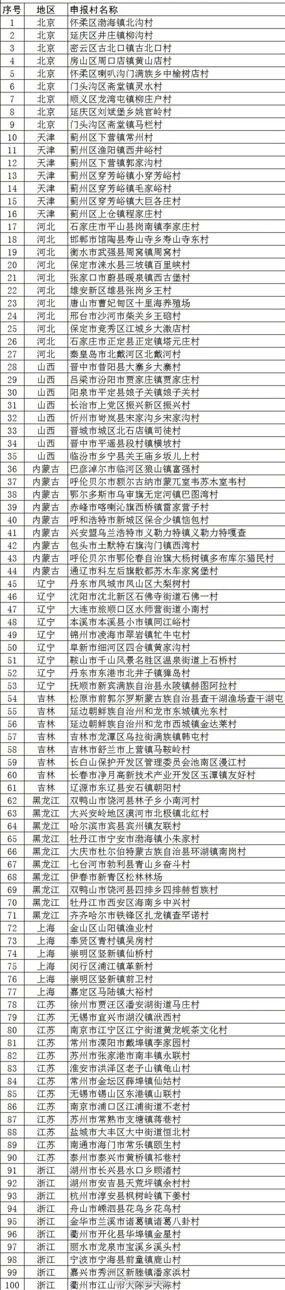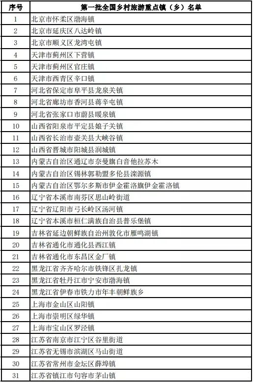 第一批全国乡村旅游重点镇(乡)名单(100个)