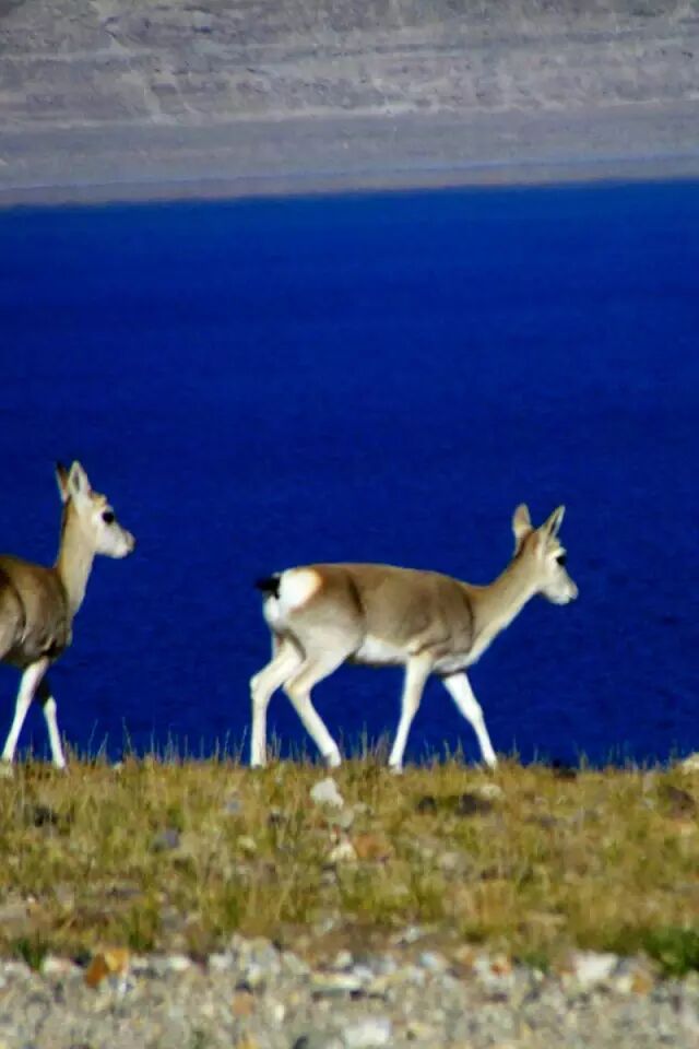 扎日南木错远山如黛,湖周岸边,芳草凄凄,盛产珍贵的紫绒山羊。沿湖有三五成群的藏羚羊、野驴等野生动物出没,奔驰在湖滨原野上。