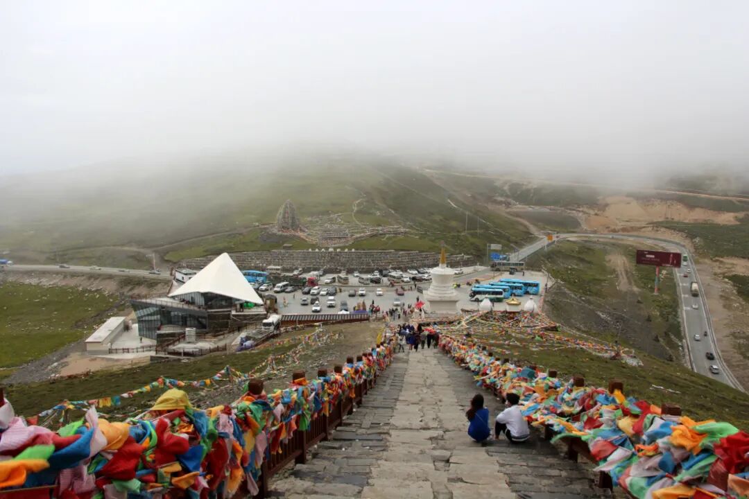 下车游览,冷风呼啸,成群的白塔,成片的彩色经幡,庄严肃穆的藏式画风,扑面而来!从观景台,上到山顶,还要爬一大段台阶,经幡缠满了栏杆,随风飘扬。沿着这条“彩带之路”慢慢上爬,高反倒轻微,只是感觉冷!
