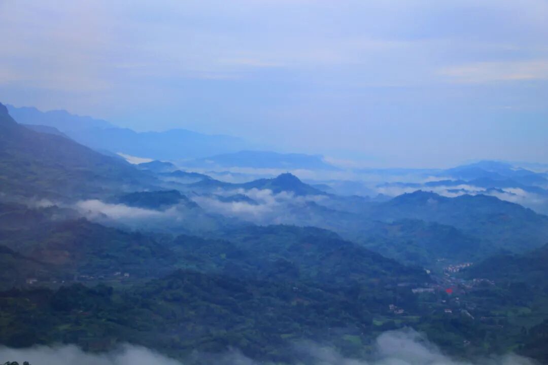 这是从未见过的奇境,海市蜃楼一般,让人叹为观止。江山如此多娇,引大家竞相停车拍照,争先恐后地下车,一顿狂拍。继续前行,常见背着小背篓的村民,上山采茶。