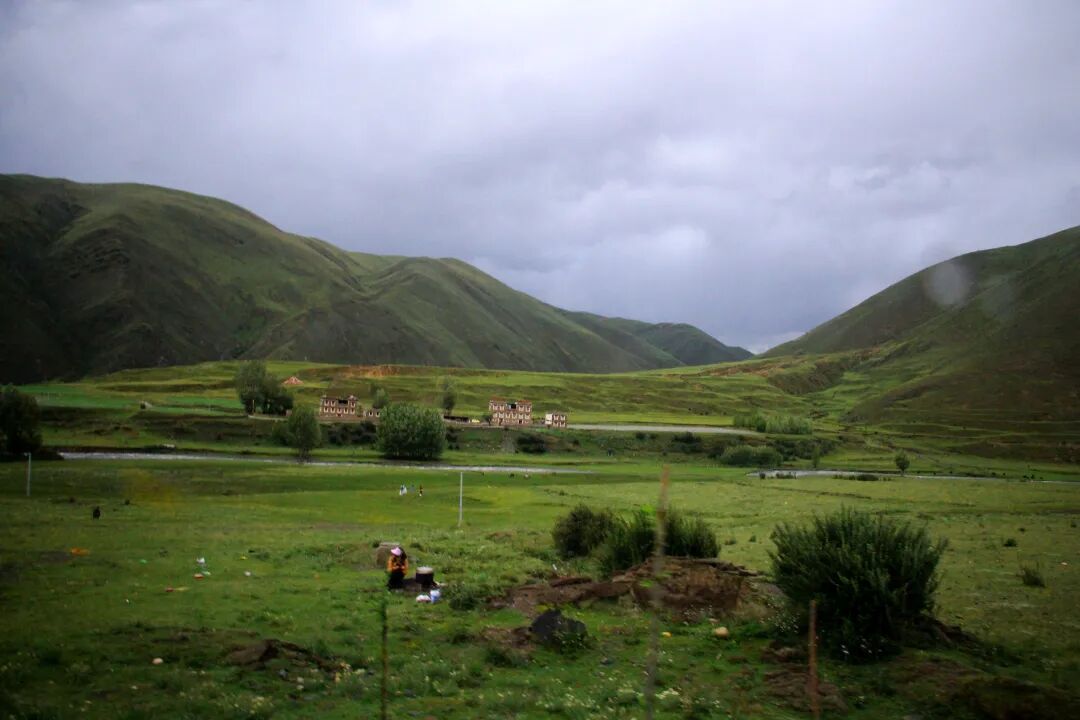 继续北上,6点,过塔公草原,青草长势良好,放眼全是厚厚的绿,弯弯曲曲的小河,颇有韵味。风景依然很好,运气却依然不佳,小雨转中雨,光线昏暗,没人愿意下车,心中满是遗憾。