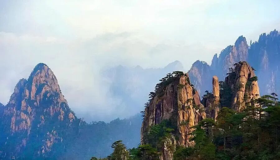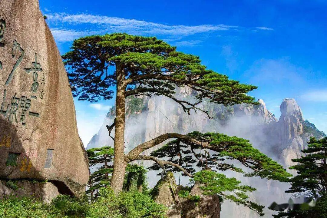黄山的松,山,云,好像是一个有机体,缺哪个都不完美,松树常常生长在山的一侧,而且许多都是孤独一颗,枝丫外伸,造型奇特,远望像一把把巨大的绿伞,平台上那颗迎客松更是闻名遐迩,伸出的枝丫像一只优雅的手迎接着八方来客。