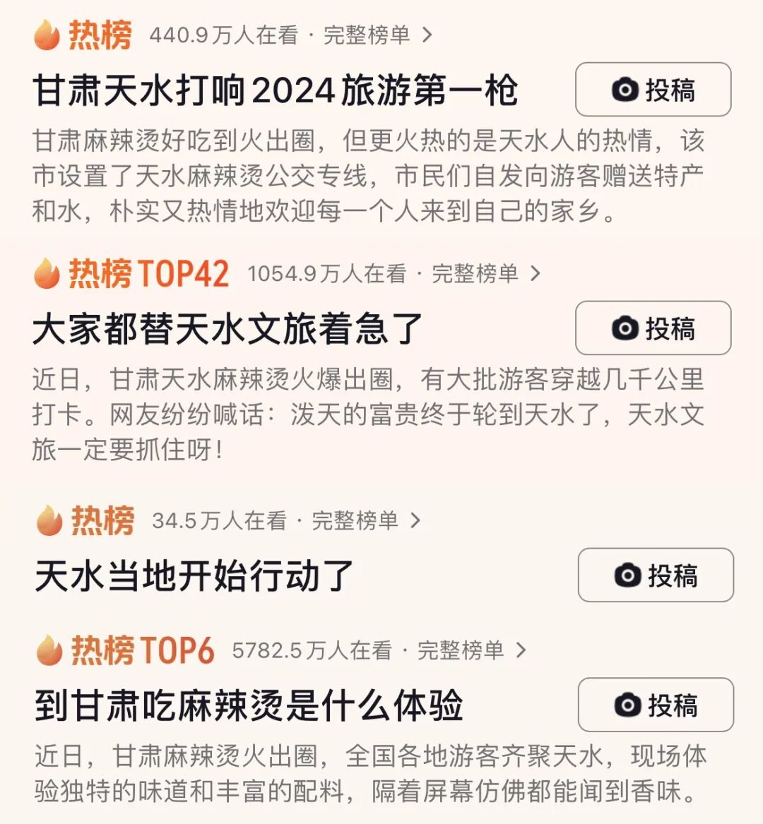 甘肃麻辣烫有多火?在各大社交平台频频登上热榜后,相关话题高达上百个,视频播放量近10亿,目前热度还在持续上涨。