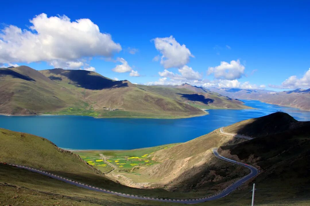 一大片湛蓝,宛如宝石,“羊卓雍错”藏语中的意思是“碧玉湖”,真是湖如其名,湖水碧绿晶莹。群峰环抱,近处有油菜花田,沿湖公路蜿蜒曲折,远处雪峰,隐约可见。