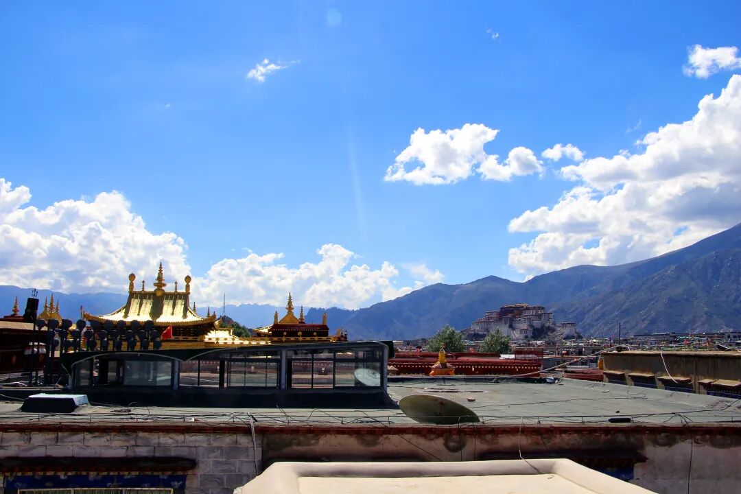 我们上到楼顶天台,就在大昭寺的后面,环视一圈,青山环绕,大昭寺的金色尖顶近在咫尺,布达拉宫清晰可见。