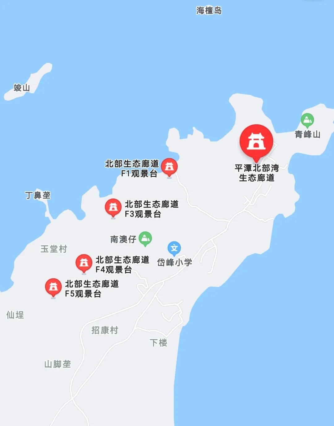 自驾路线:高德、百度和腾讯地图直接搜索平潭北部生态廊道,会出现好几个观景台河打卡点,逐个导航前往。