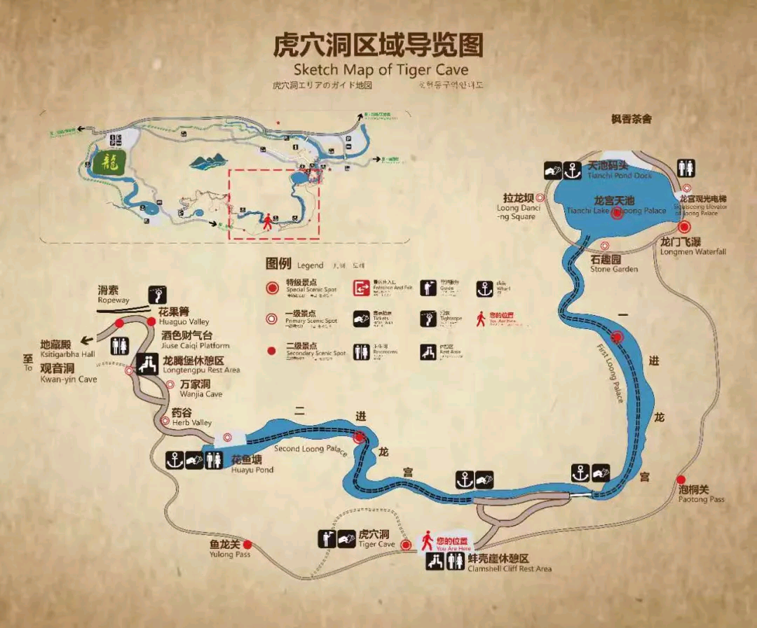 →一进龙宫→虎穴洞(位于一进龙宫和二进龙宫之间的旱溶洞,上山游玩后需原路返回前往二进龙宫乘船)