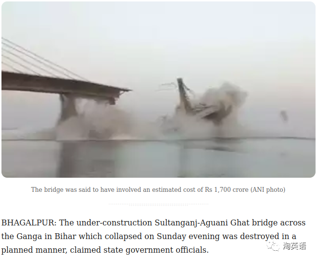 在建的比哈尔邦横跨恒河的Sultanganj Aguani Ghat大桥于周日晚上倒塌,该桥已按计划被毁。