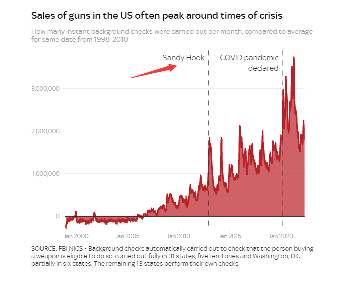 有统计数据显示,每当美国社会发生动荡的时候,枪支的销量就会上升,而枪击案对此影响尤其明显。比如2012年发生了一起26人死亡的校园枪击案,全美当年的枪支销量就比预期高出了300多万。
